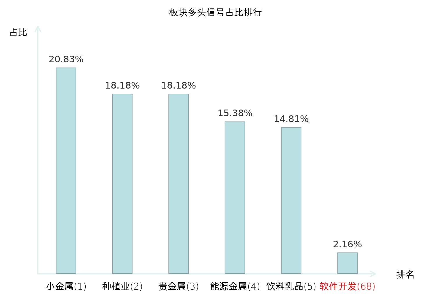全市场所有行业板块中主力多头信号占比排名中,小金属板块位居第一。房屋建设Ⅱ板块名次提升最快,较昨日上升111位。