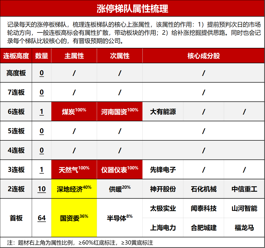 点评:冷冬概念昨天分化兑现是预期之内的,趋势板块高潮即兑现是量化一贯的套路,后面板块还有一次回流的预期,大有能源这里开一字跟监管硬碰硬还是比较超预期,而且它本身也叠加了国企改革的概念,午后易成新能神马股份平煤股份都有过联动,如果后面大有继续超预期的话,它们还会有补涨的潜力