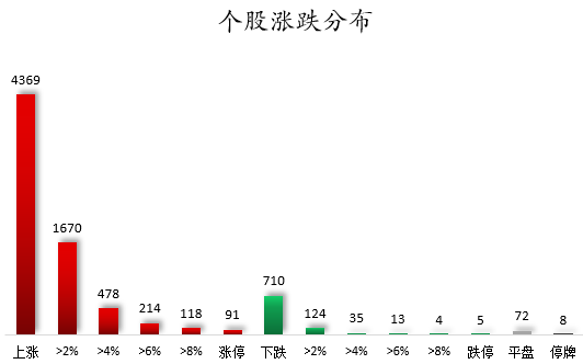 个股涨跌情况,截至收盘,沪深两市合计4369只个股上涨,710只个股下跌,平盘个股72只,停牌的个股8只。不含当日上市新股,共有91只个股涨停,5只个股跌停。