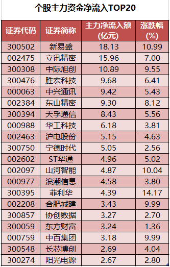 个股来看,今日有2092只个股获主力资金净流入,其中,89股获主力资金净流入超1亿元。新易盛主力资金净流入最多,净流入金额为18.13亿元;主力资金净流入居前的个股还有立讯精密、中际旭创、胜宏科技、中兴通讯、东山精密等,净流入金额分别为15.96亿元、10.89亿元、9.68亿元、9.42亿元、9.3亿元。