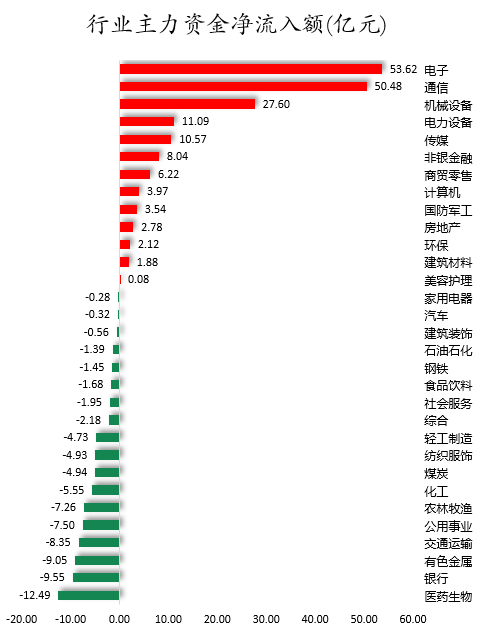 从行业来看,申万所属的31个一级行业,今日有13个行业主力资金呈现净流入,其中,电子行业主力资金净流入最多,净流入金额为53.62亿元;行业主力资金净流入居前的还有通信、机械设备、电力设备、传媒等,净流入金额分别为50.48亿元、27.6亿元、11.09亿元、10.57亿元。18个行业主力资金呈现净流出,其中,医药生物行业主力资金净流出最多,净流出金额为12.49亿元;行业主力资金净流出靠前的还有银行、有色金属、交通运输、公用事业、农林牧渔等,净流出金额分别为9.55亿元、9.05亿元、8.35亿元、7.5亿元、7.26亿元。