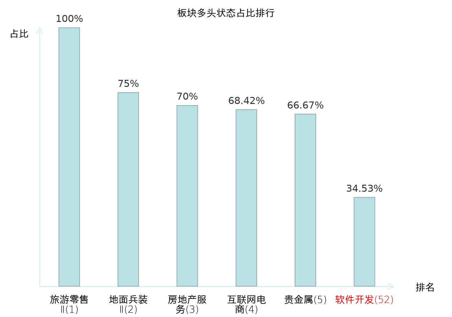 全市场所有行业板块中主力多头状态占比排名中,旅游零售Ⅱ板块位居第一。白色家电板块名次提升最快,较昨日上升65位。