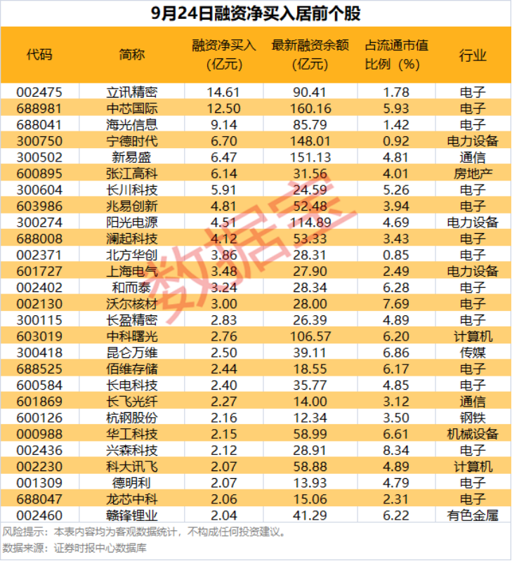 具体到个股,9月24日获融资净买入1亿元以上的有73只,其中,7股融资净买入均超5亿元。立讯精密融资净买入额居首,当日净买入14.61亿元;其次是中芯国际、海光信息,融资净买入金额分别为12.50亿元、9.14亿元;融资净买入金额居前的还有宁德时代、新易盛、张江高科等。