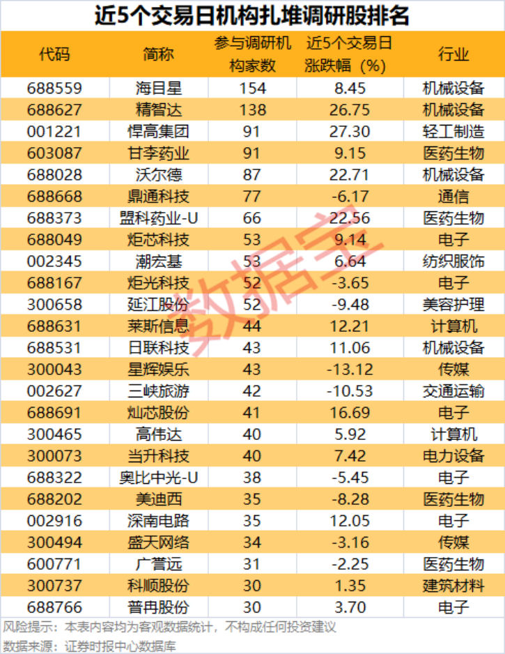 机构调研榜单中,共有25家公司获30家及以上机构扎堆调研。其中,2家公司获超百家机构调研,海目星最受关注,参与调研的机构达到154家;精智达被138家机构调研;悍高集团、甘李药业、盟科药业-U等多家公司获超50家机构调研。