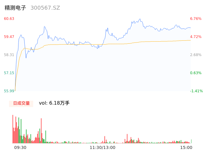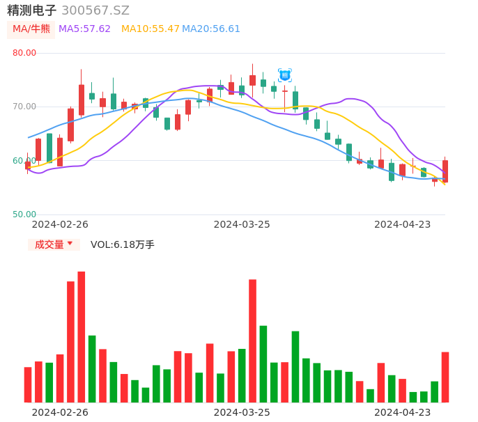 04月23日,精测电子收报60.00,股价涨幅5.65%,成交金额3.66亿元,换手率2.99%。