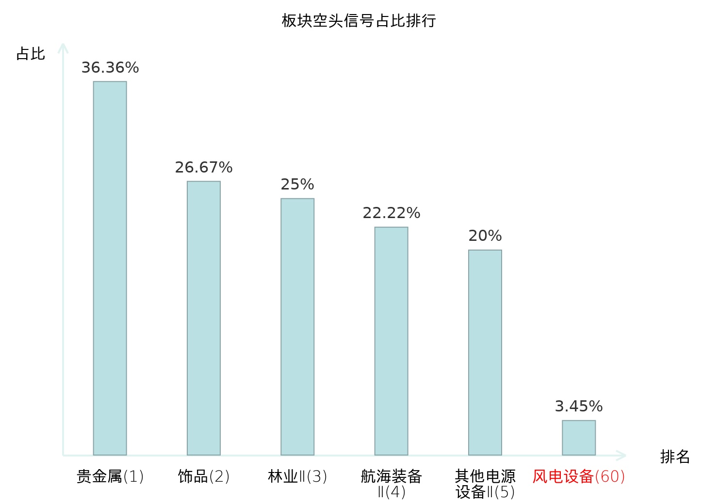全市场所有行业板块中主力空头信号占比排名中,贵金属板块位居第一。工业金属板块名次提升最快,较昨日上升125位。