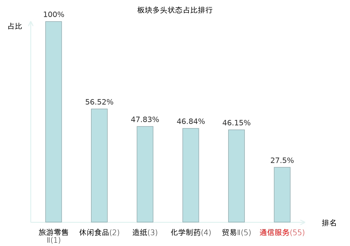 全市场所有行业板块中主力多头状态占比排名中,旅游零售Ⅱ板块位居第一。动物保健Ⅱ板块名次提升最快,较昨日上升58位。