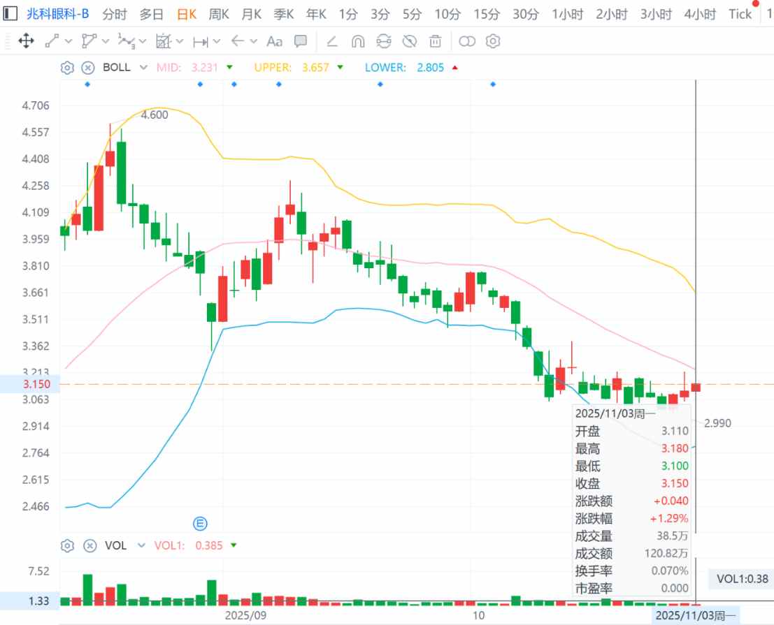 然而,二级市场似乎并未为之所动。盘面上看,市场仅在10月22日午盘后出现异动,将公司股价从0轴拉升至最高3.58%,并最终在小幅波动后以该涨幅收盘。但如此涨幅仅持续了一天,公司次日股价迅速收跌4.72%,回吐了前一日的全部涨幅。并且在后续多个交易日,兆科眼科股价都在横盘震荡,股价最低甚至跌至2.9港元。
