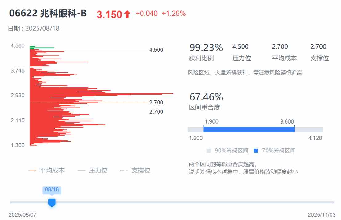 经过2个半月的调整,兆科眼科的场内筹码平均成本已来到3.24港元,筹码峰也来到3港元附近,并且2港元以下的筹码基本已清洗完毕,71.87%的筹码重合度也从侧面说明主力资金控盘能力进一步提高。