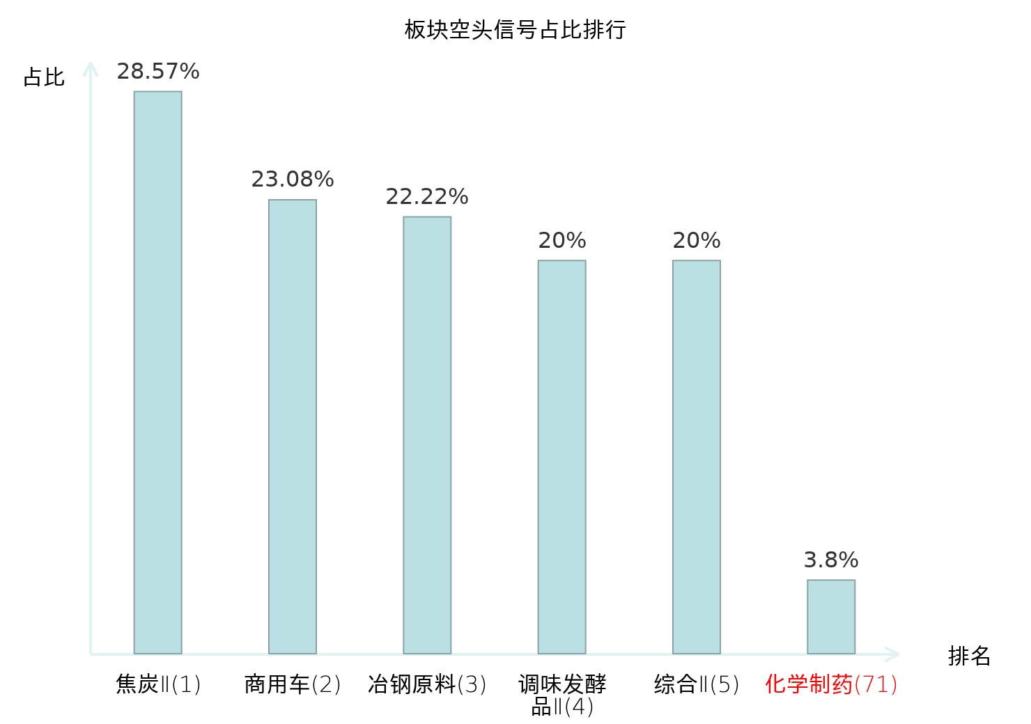 全市场所有行业板块中主力空头信号占比排名中,焦炭Ⅱ板块位居第一。铁路公路板块名次提升最快,较昨日上升109位。