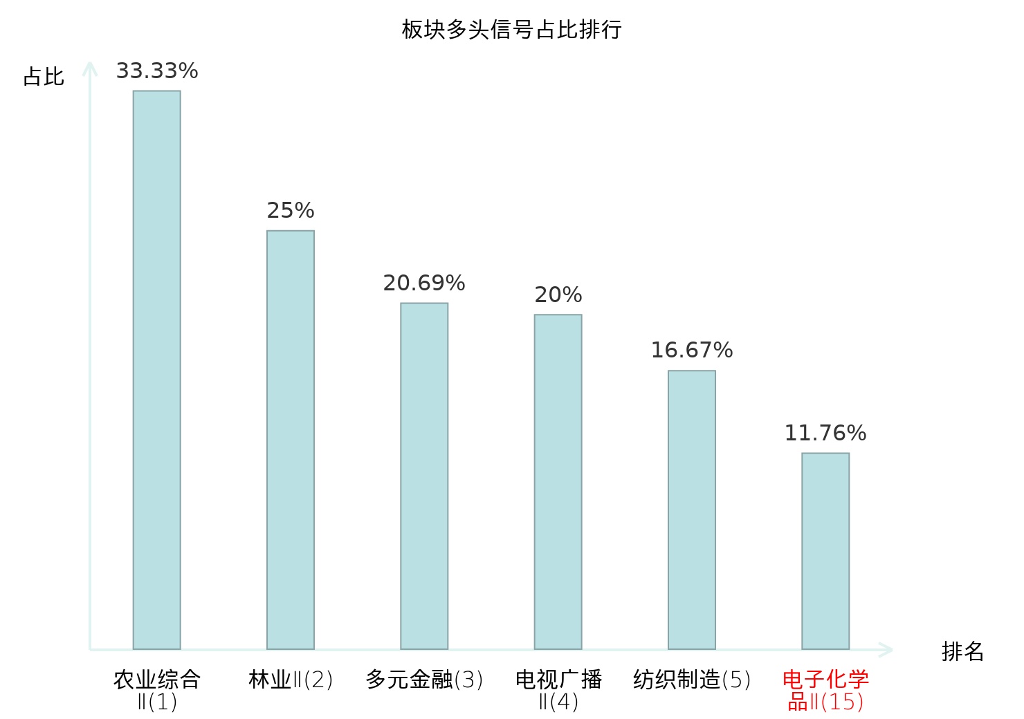 全市场所有行业板块中主力多头信号占比排名中,农业综合Ⅱ板块位居第一。农业综合Ⅱ板块名次提升最快,较昨日上升127位。