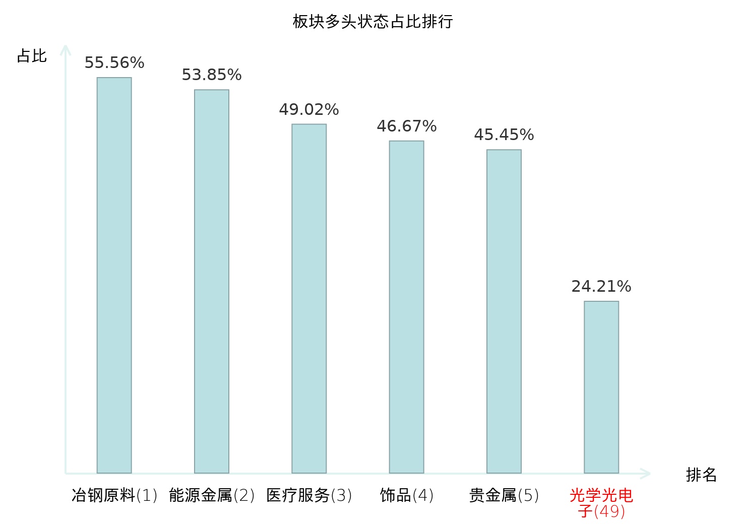 全市场所有行业板块中主力多头状态占比排名中,冶钢原料板块位居第一。能源金属板块名次提升最快,较昨日上升89位。