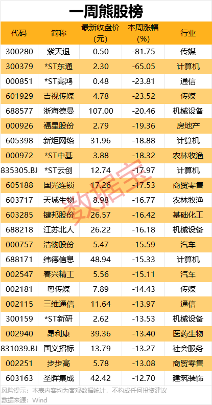 本周累计下跌的个股中,5股跌幅在20%及以上。紫天退累计跌超80%,居首;*ST东通、*ST高鸿、吉视传媒、浙海德曼等个股累计跌幅也居前。