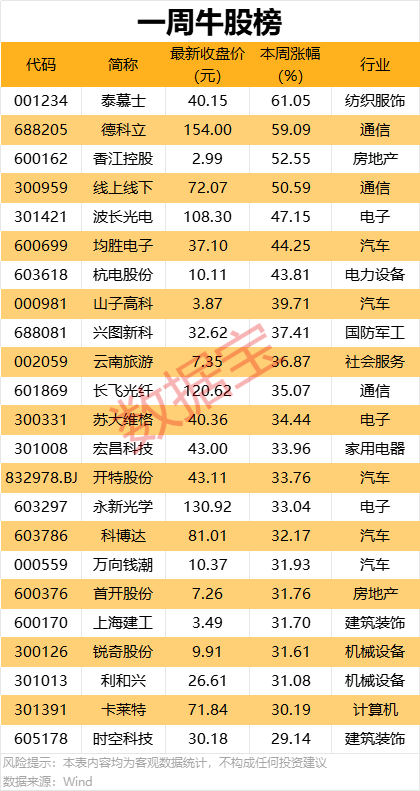 个股方面,本周超1700股上涨,22股涨幅超30%。其中,涨幅最大的是泰慕士,本周累计上涨61.05%;德科立、香江控股、线上线下本周累计涨幅均超50%。