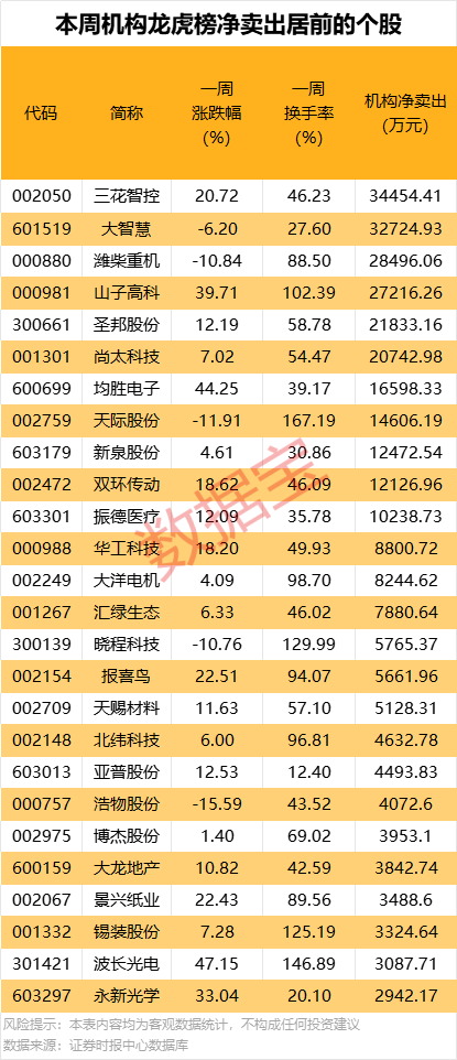 机构净卖出的个股中,净卖出金额最多的是三花智控,该股本周累计上涨20.72%,周换手率为46.23%,因日涨幅偏离值达9.26%、连续三个交易日内,涨幅偏离值累计达27.38%等1次上榜龙虎榜,买卖居前营业部中机构合计净卖出3.45亿元,同时上榜的还有深股通专用席位,净卖出1.80亿元,营业部席位一周合计净买入6.41亿元。