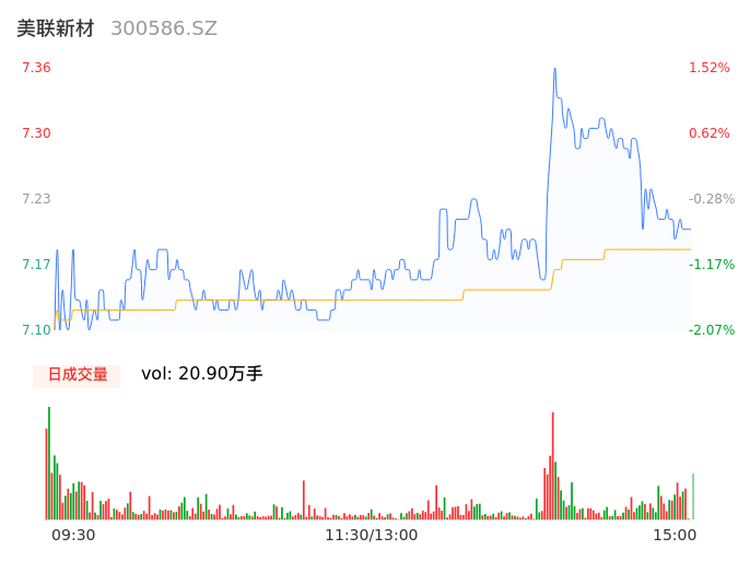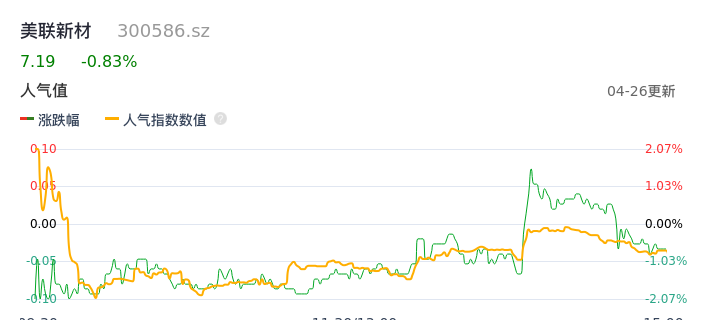 04月26日,美联新材收报7.19,股价涨幅-0.83%,成交金额1.50亿元,换手率3.91%。