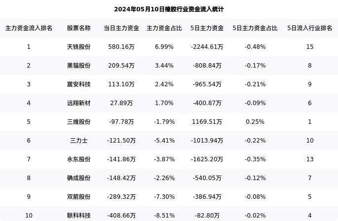下表为今日行业内流入前10股票的信息