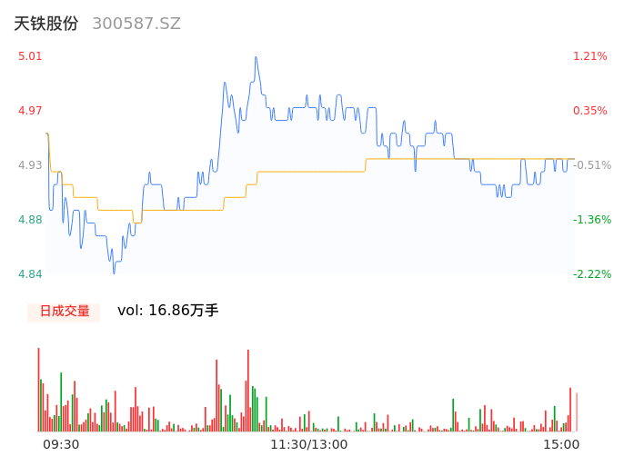 05月10日,天铁股份收报4.93,股价涨幅-0.40%,成交金额8302.33万元,换手率1.78%。