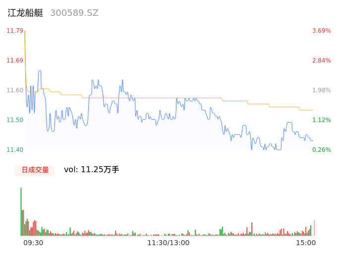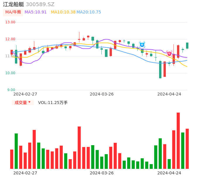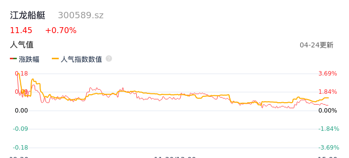 04月24日,江龙船艇收报11.45,股价涨幅0.70%,成交金额1.30亿元,换手率5.05%。