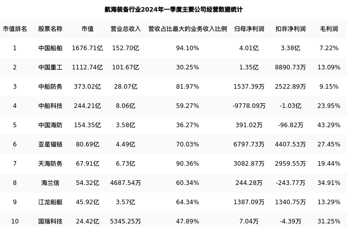 江龙船艇最新报告期数据为一季度,下表汇总了航海装备行业内市值靠前的公司一季度主要经营数据
