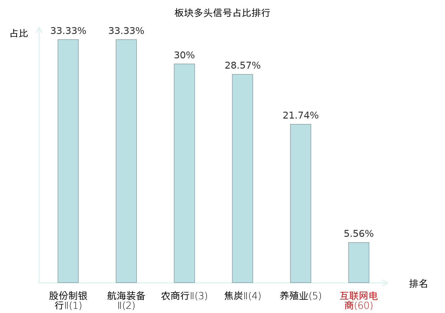 全市场所有行业板块中主力多头信号占比排名中,股份制银行Ⅱ板块位居第一。焦炭Ⅱ板块名次提升最快,较昨日上升119位。
