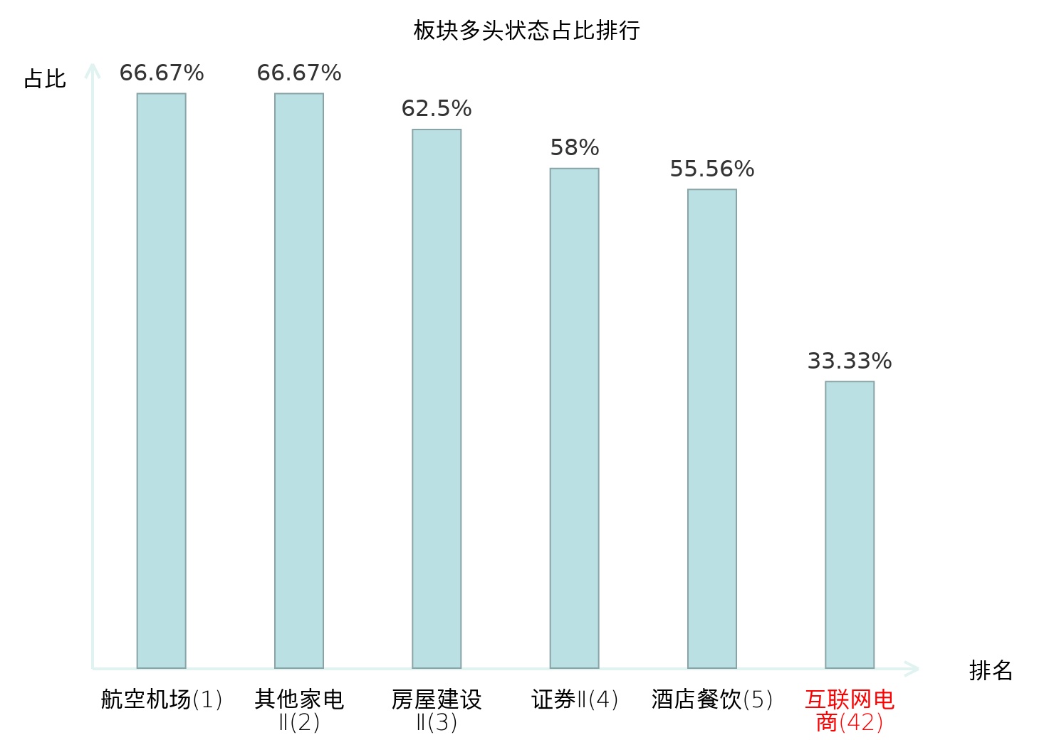 全市场所有行业板块中主力多头状态占比排名中,航空机场板块位居第一。装修建材板块名次提升最快,较昨日上升62位。