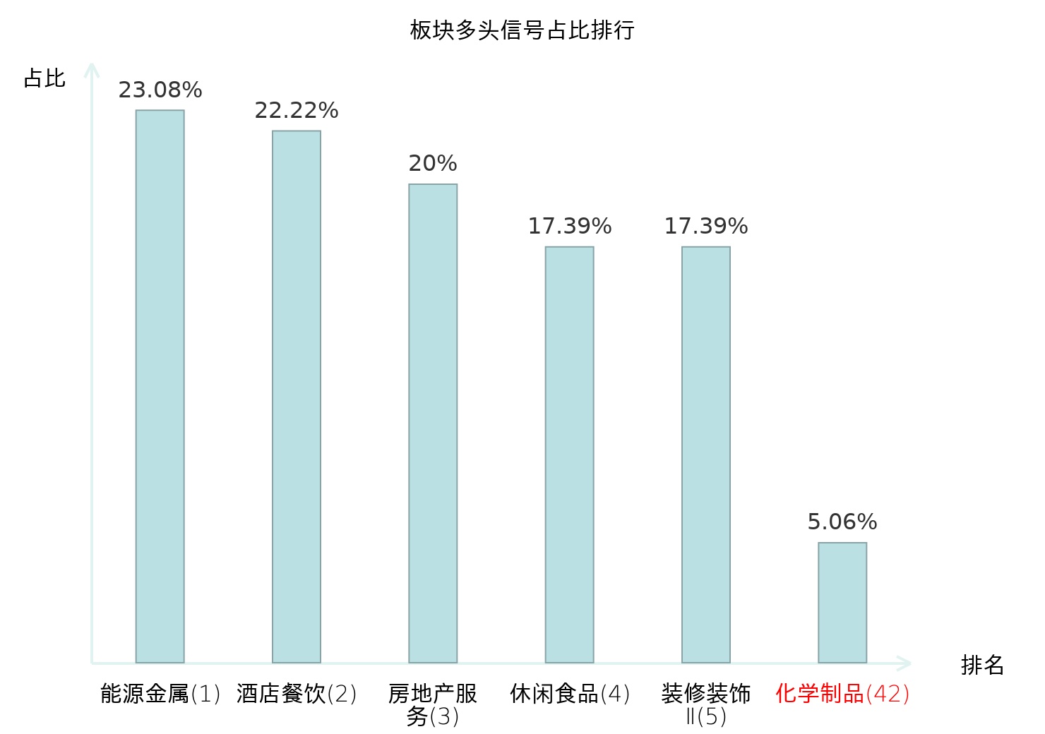 全市场所有行业板块中主力多头信号占比排名中,能源金属板块位居第一。渔业板块名次提升最快,较昨日上升116位。