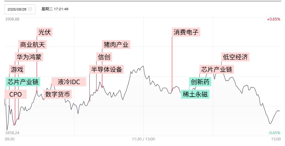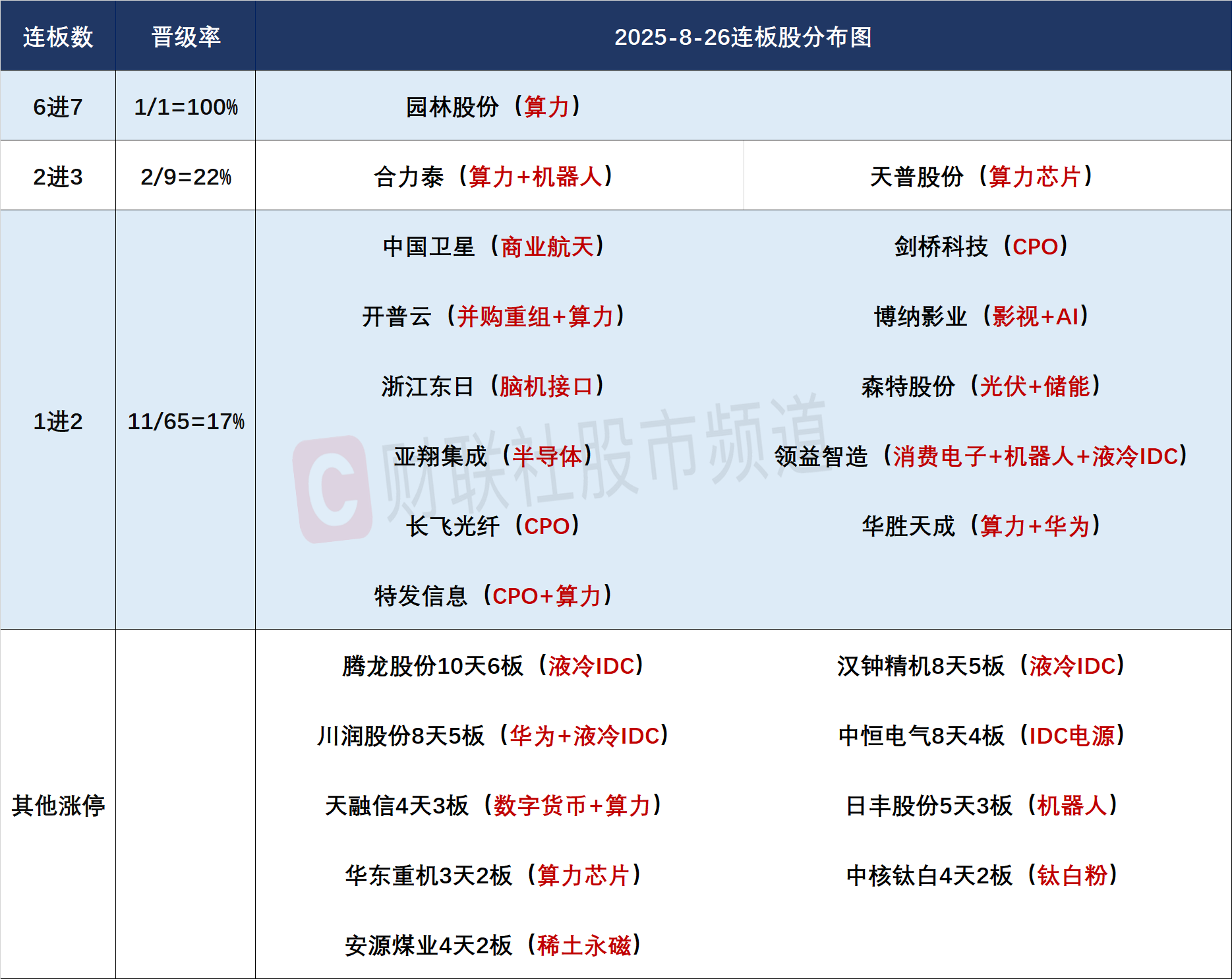 连板晋级率降至25%,最高标园林股份日内以“准地天板”晋级7连板,但3板及以上个股仍仅有3只,且昨日首板股晋级率依旧维持不足两成水平。历史新高指数在连续两日加速后,今日全天低开低走处于水下运行,其中此前大面积爆发的国产算力芯片方向展开补跌的同时,算力硬件端不少高位股也展开补跌,淳中科技尾盘跌停,淳中科技等也纷纷位居跌幅前列。随着板块内核心正主的业绩落地,其余大部分缺乏业绩的投机小票表现容易受到压制,近期中报业绩超预期个股赚钱效应持续加强,今日更是有十余股涨停,也反映出资金持续聚焦业绩超预期个股展开避险的心态。