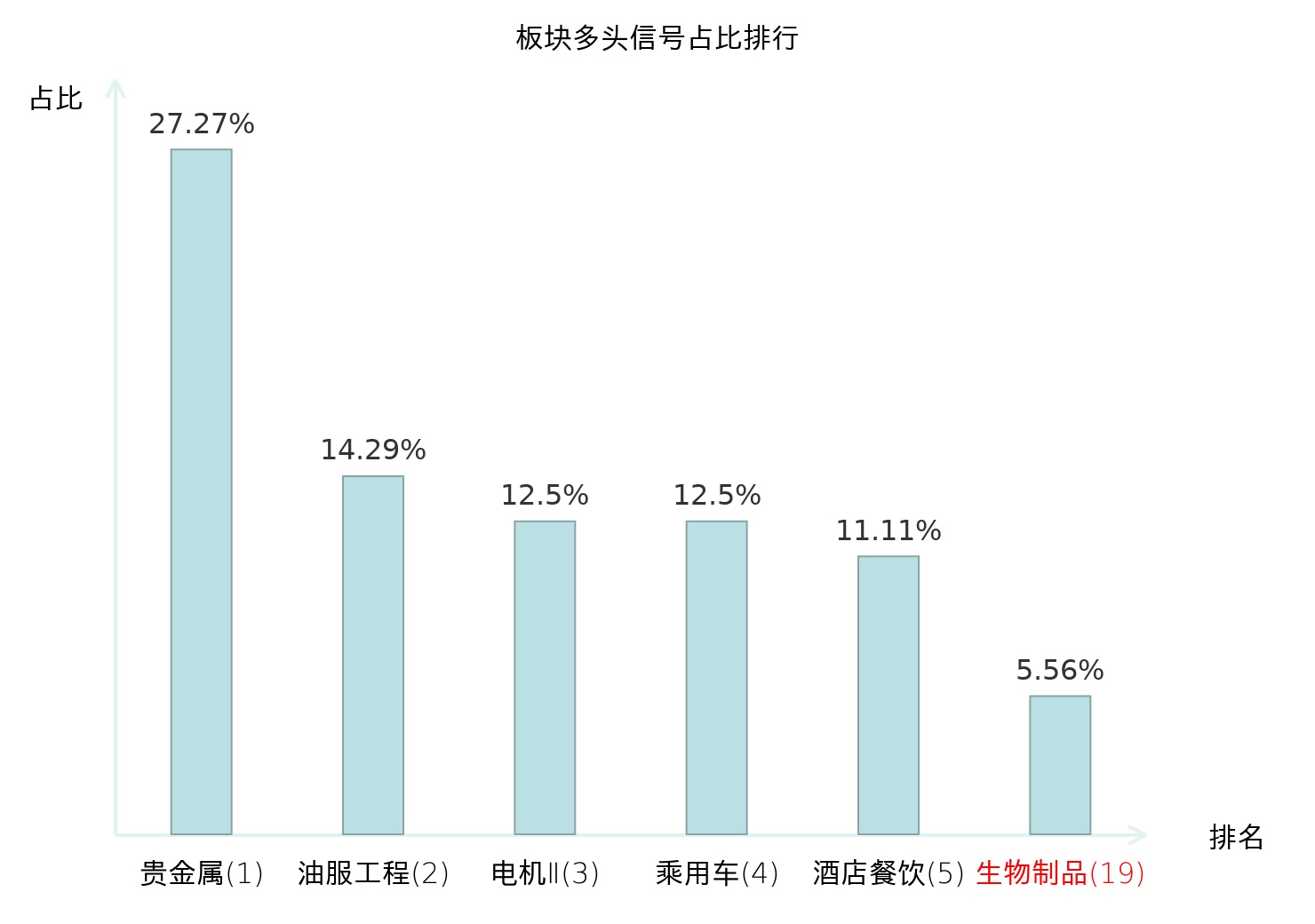 全市场所有行业板块中主力多头信号占比排名中,贵金属板块位居第一。乘用车板块名次提升最快,较昨日上升114位。
