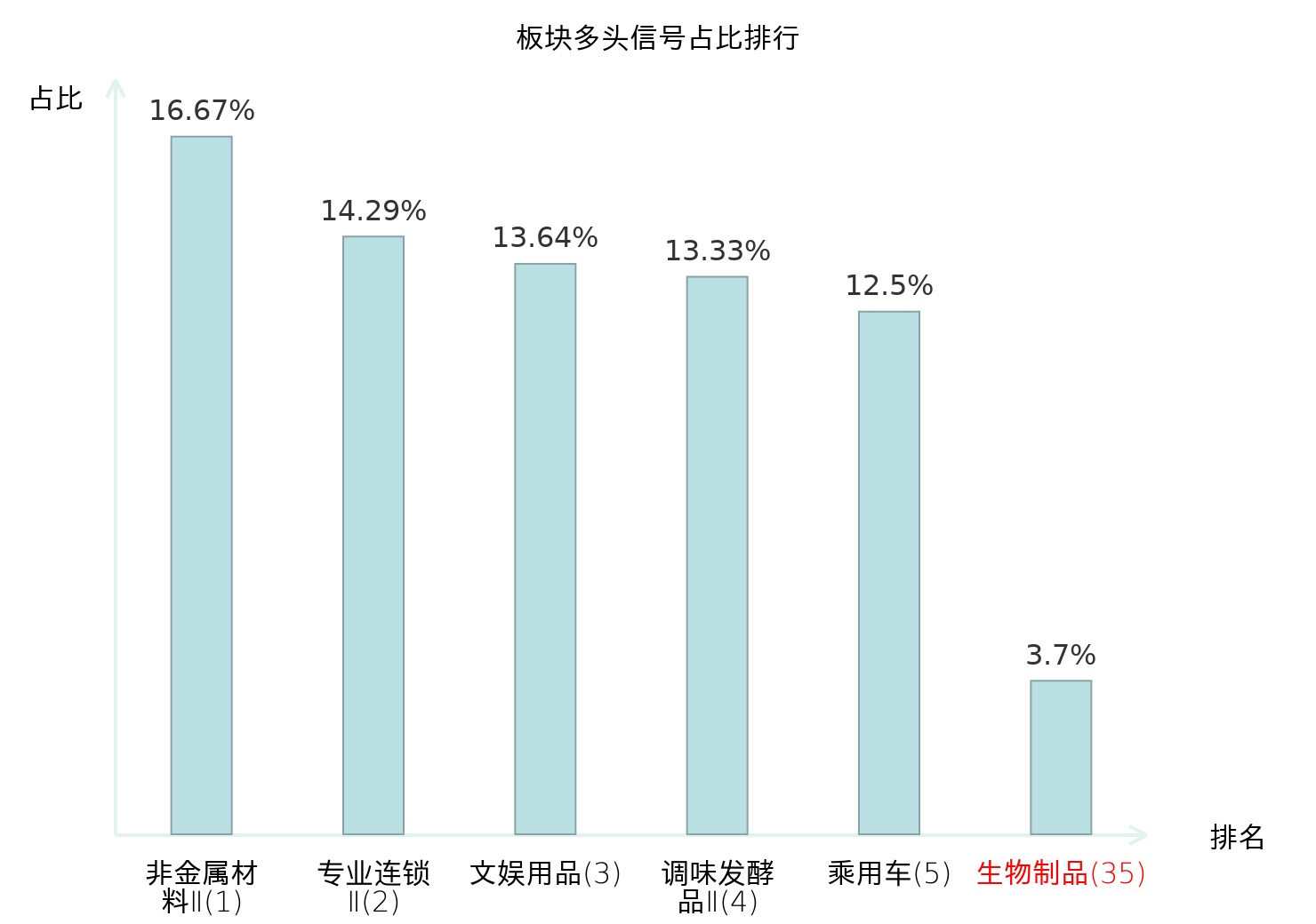 全市场所有行业板块中主力多头信号占比排名中,非金属材料Ⅱ板块位居第一。乘用车板块名次提升最快,较昨日上升115位。