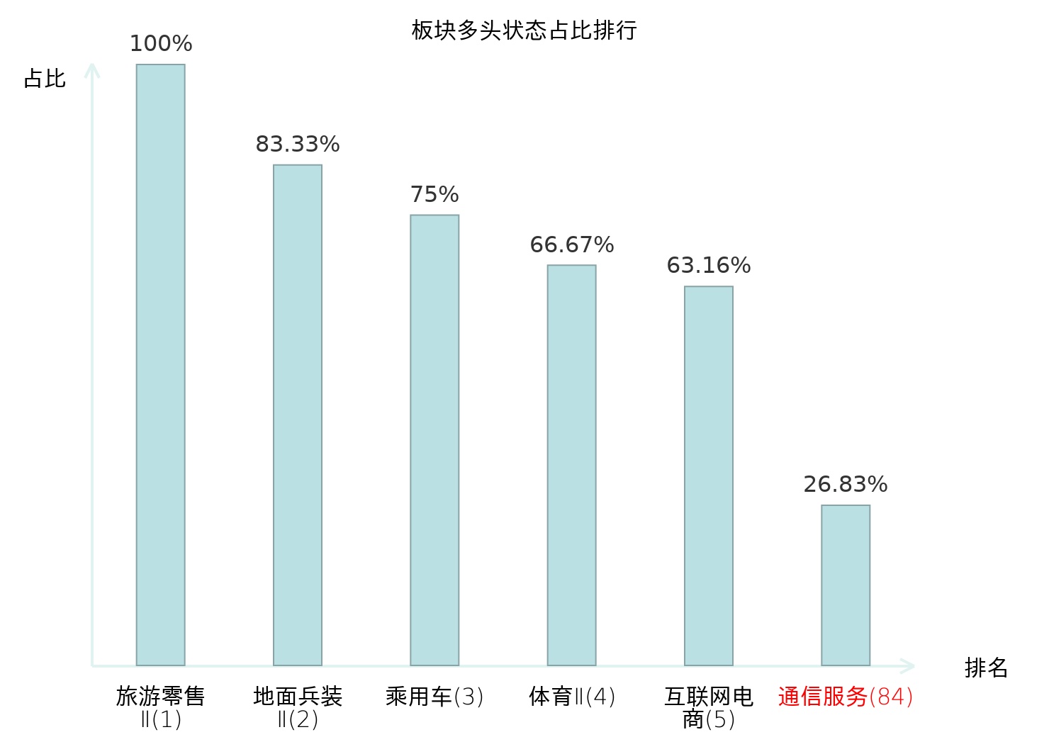 全市场所有行业板块中主力多头状态占比排名中,旅游零售Ⅱ板块位居第一。消费电子板块名次提升最快,较昨日上升52位。