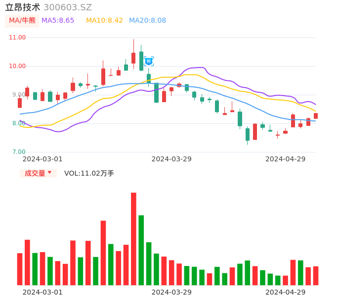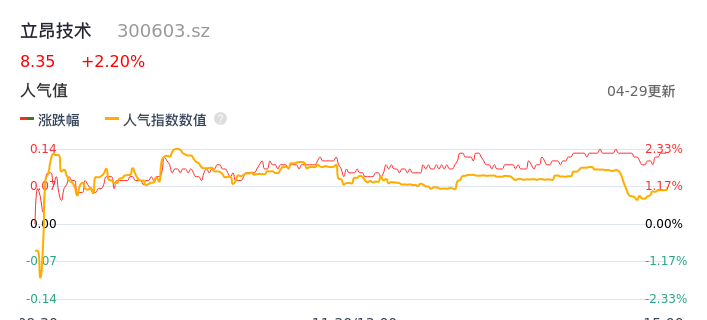 04月29日,立昂技术收报8.35,股价涨幅2.20%,成交金额9149.72万元,换手率3.09%。