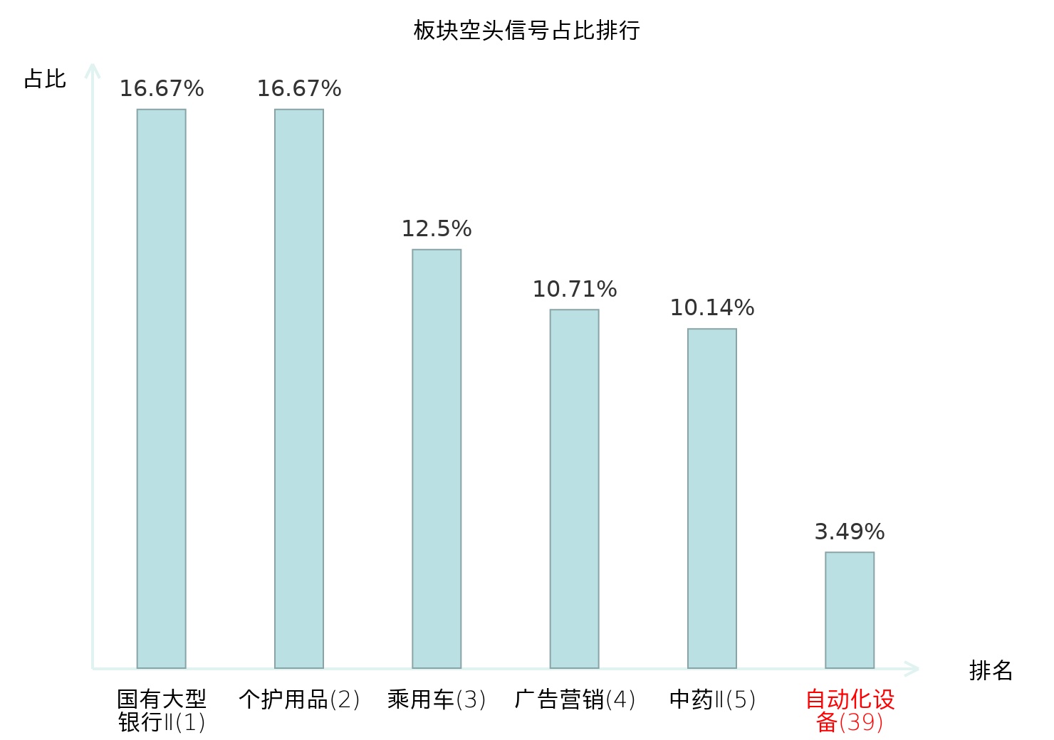 全市场所有行业板块中主力空头信号占比排名中,国有大型银行Ⅱ板块位居第一。医疗服务板块名次提升最快,较昨日上升110位。
