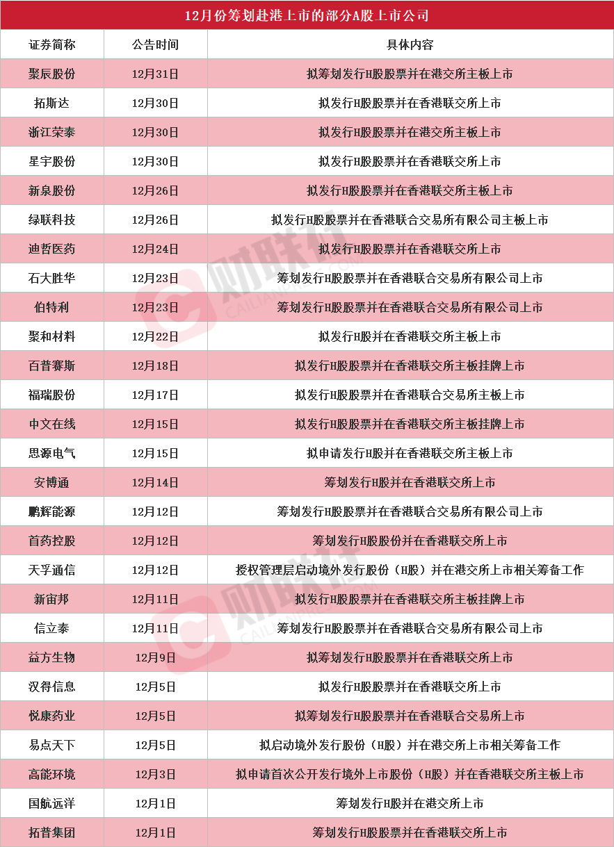 财联社1月2日讯(编辑 平方)A股公司赴港上市热潮延续。据财联社不完全统计,截至发稿,12月份共有27家A股上市公司公告筹划赴港上市,包括聚辰股份、拓斯达、浙江荣泰、星宇股份、新泉股份、绿联科技、迪哲医药、石大胜华、伯特利、聚和材料、百普赛斯、福瑞股份、中文在线、思源电气、安博通、鹏辉能源、首药控股、天孚通信、新宙邦、信立泰、益方生物、汉得信息、悦康药业、易点天下、高能环境、国航远洋、拓普集团,详细情况见下图:
