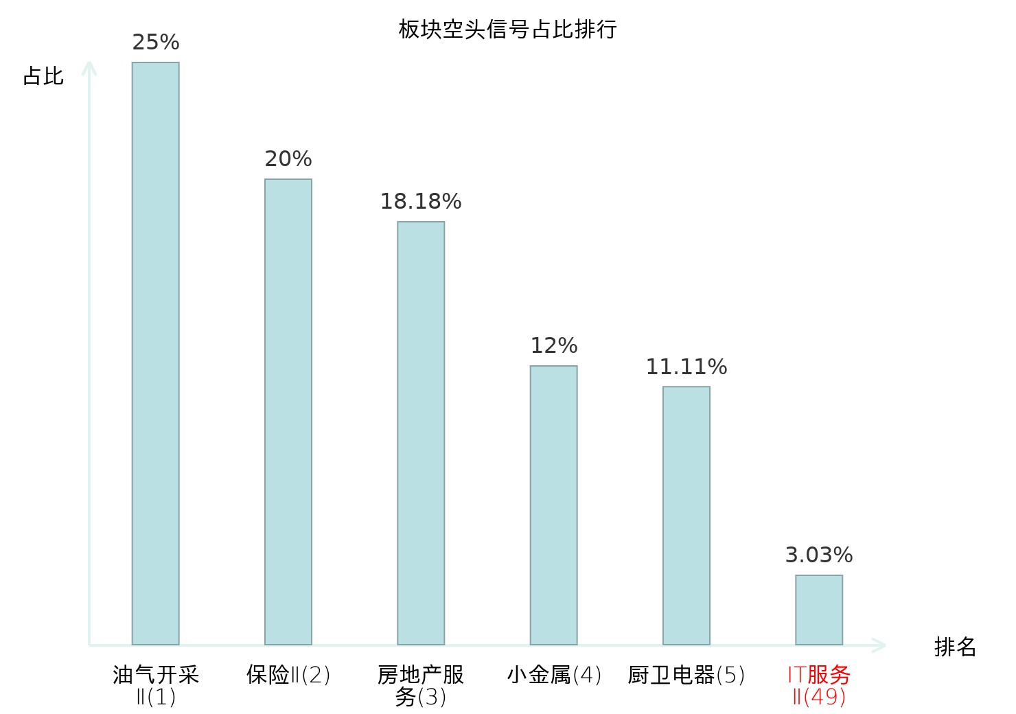 全市场所有行业板块中主力空头信号占比排名中,油气开采Ⅱ板块位居第一。装修建材板块名次提升最快,较昨日上升117位。