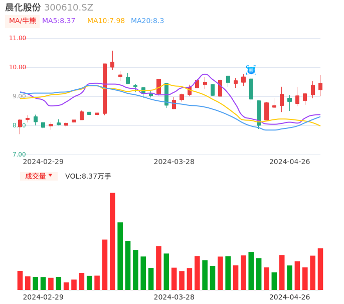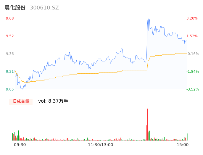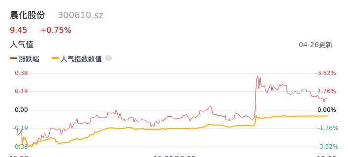 04月26日,晨化股份收报9.45,股价涨幅0.75%,成交金额7845.30万元,换手率5.26%。