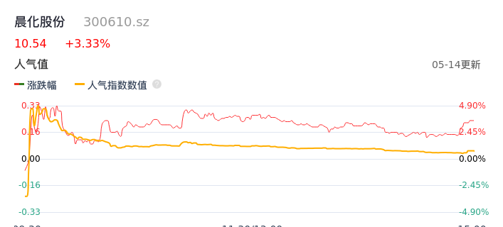 05月14日,晨化股份收报10.54,股价涨幅3.33%,成交金额1.46亿元,换手率8.70%。