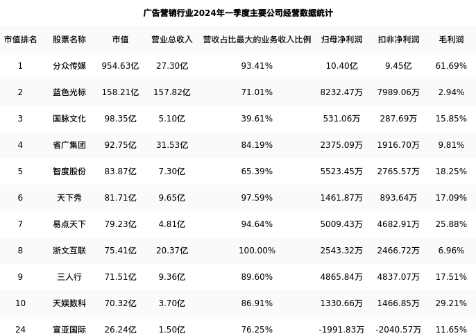 宣亚国际最新报告期数据为一季度,下表汇总了广告营销行业内市值靠前的公司一季度主要经营数据