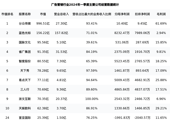 宣亚国际最新报告期数据为一季度,下表汇总了广告营销行业内市值靠前的公司一季度主要经营数据