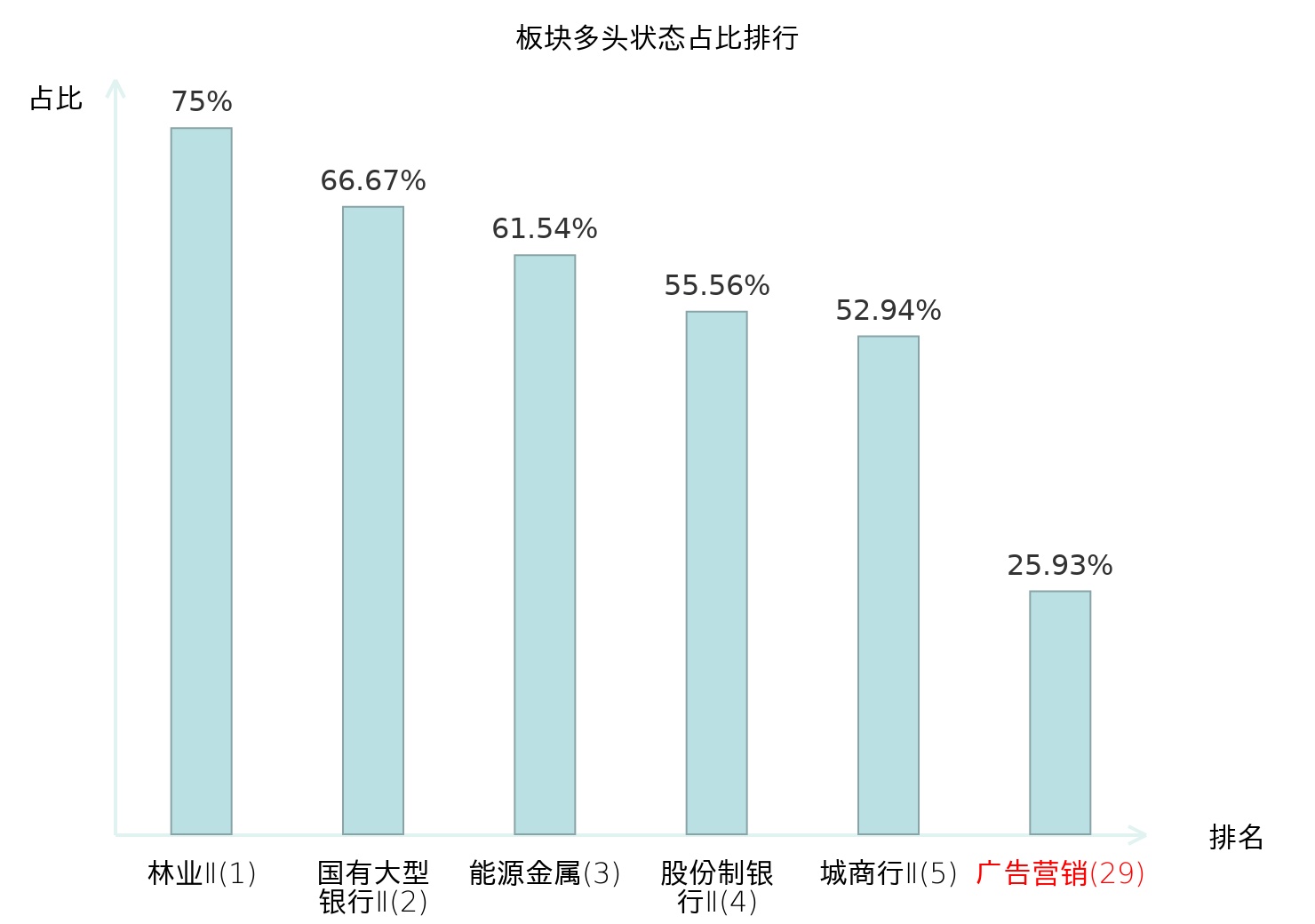 从主力宝信号数据分析,宣亚国际所属的广告营销板块中共7只股票处于主力多头状态,主力多头状态占比在全行业中排名第29位,较昨日下降8位。较高的排名表明主力对于该板块整体看多意愿较强,而此次排名下降可能反映了主力对该板块态度的阶段性调整。全市场所有行业板块中主力多头状态占比排名中,林业Ⅱ板块位居第一;动物保健Ⅱ板块名次提升最快,较昨日上升82位。这些变动体现了主力资金在不同行业间的配置倾向变化,为投资者评估板块相对强度及潜在关注方向提供了客观参考依据。