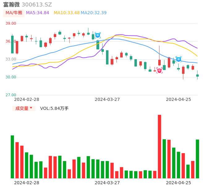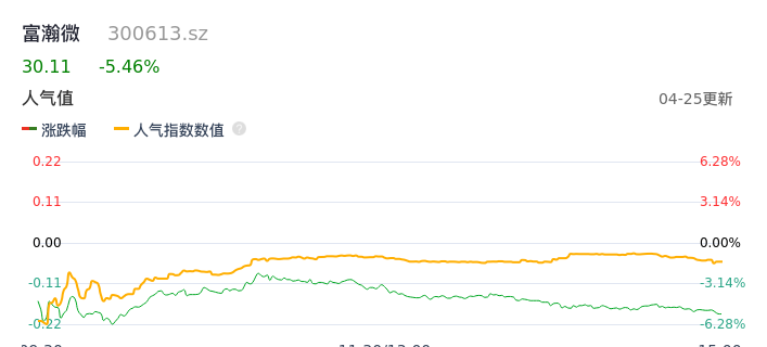 04月25日,富瀚微收报30.11,股价涨幅-5.46%,成交金额1.77亿元,换手率2.68%。