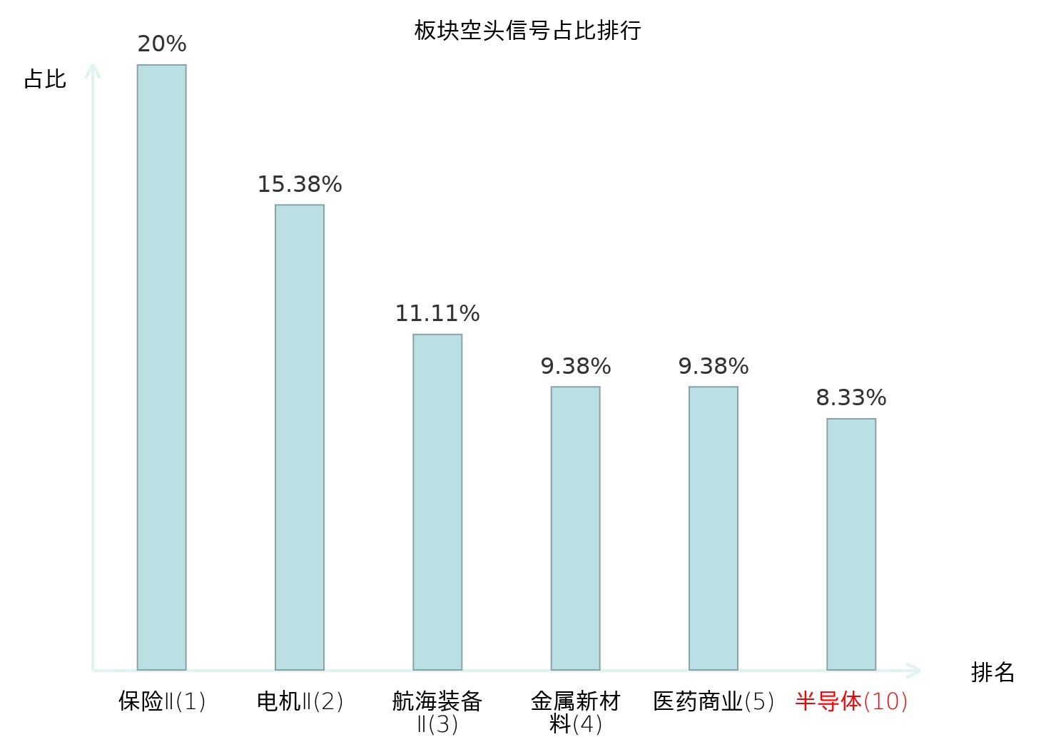 全市场所有行业板块中主力空头信号占比排名中,保险Ⅱ板块位居第一。塑料板块名次提升最快,较昨日上升111位。