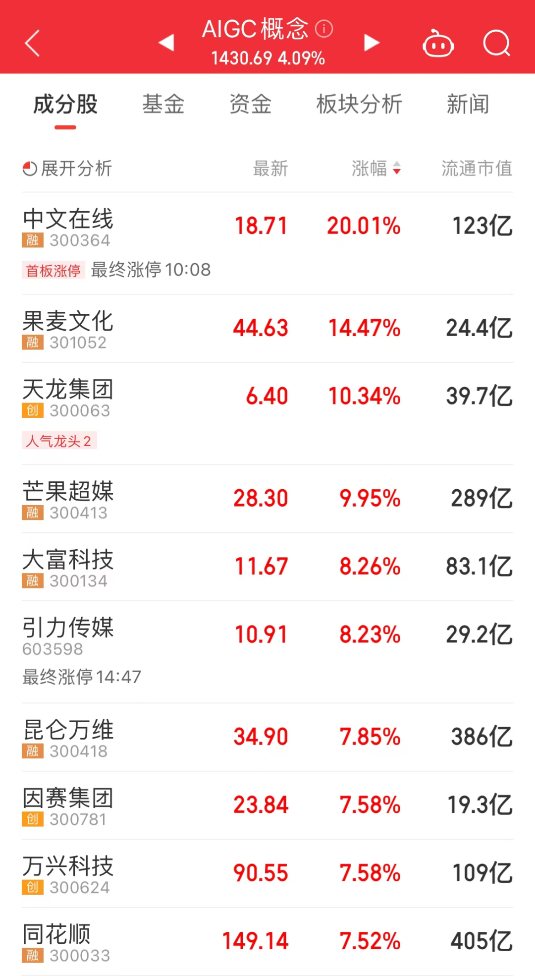除证券板块外,AIGC概念股同样大幅上涨,中文在线录得20cm的涨停板,果麦文化、天龙集团、芒果超媒、引力传媒、昆仑万维等涨超7%。
