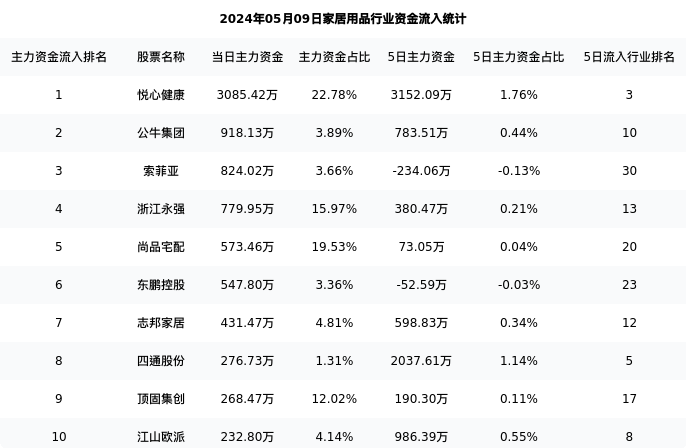 从主力资金流向来看,家居用品行业今日主力资金流入6.76亿元,在所有申万二级行业中排名:120/131。