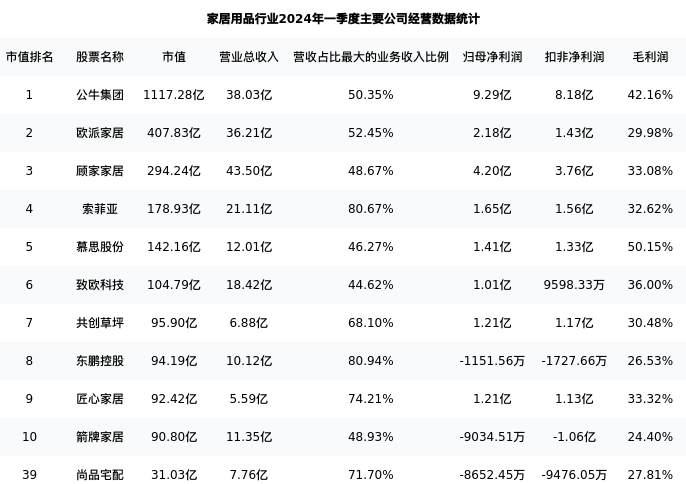 尚品宅配最新报告期数据为一季度,下表汇总了家居用品行业内市值靠前的公司一季度主要经营数据
