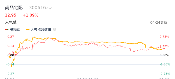 04月24日,尚品宅配收报12.95,股价涨幅1.09%,成交金额2501.51万元,换手率1.49%。
