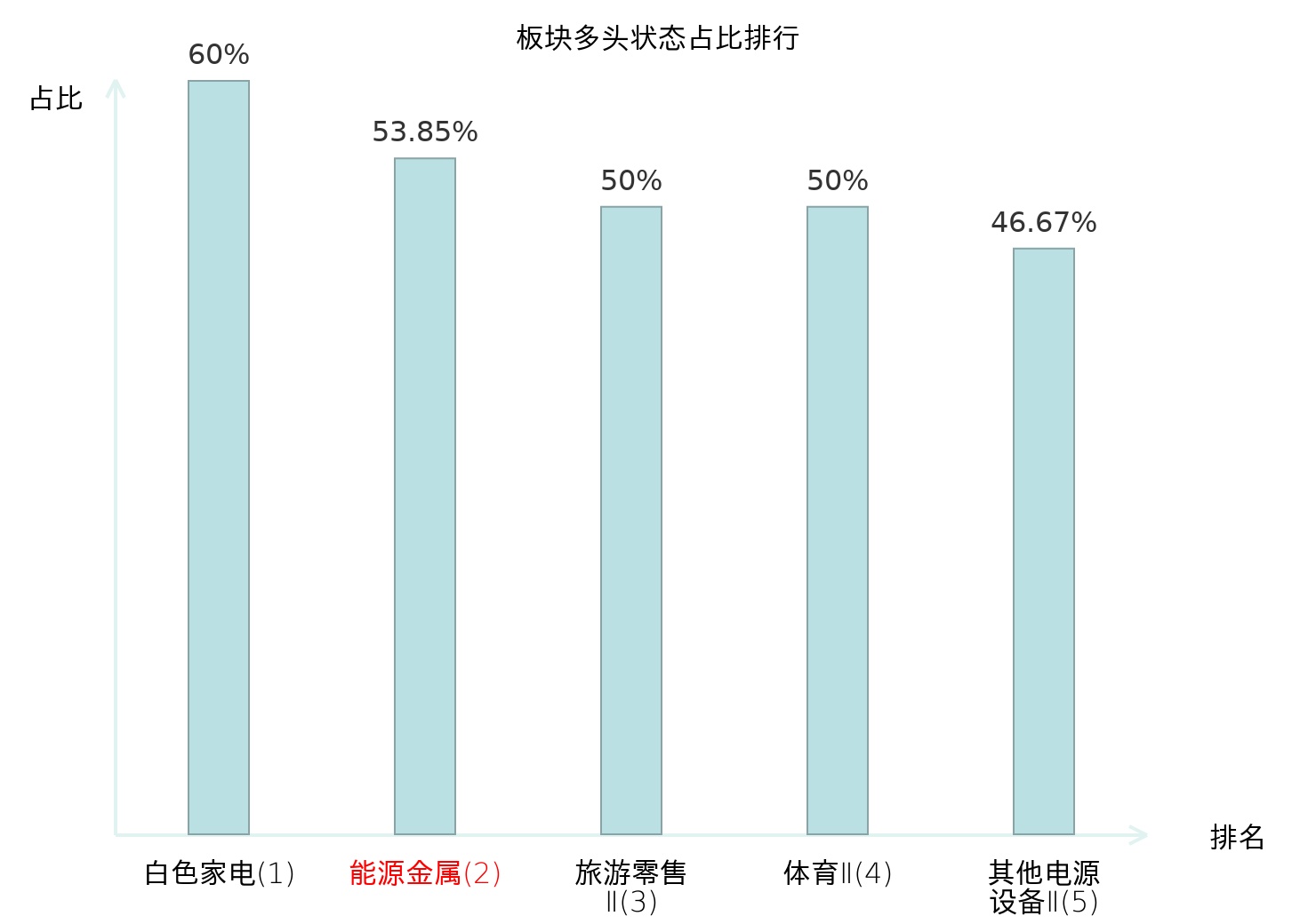 全市场所有行业板块中主力多头状态占比排名中,白色家电板块位居第一。体育Ⅱ板块名次提升最快,较昨日上升127位。