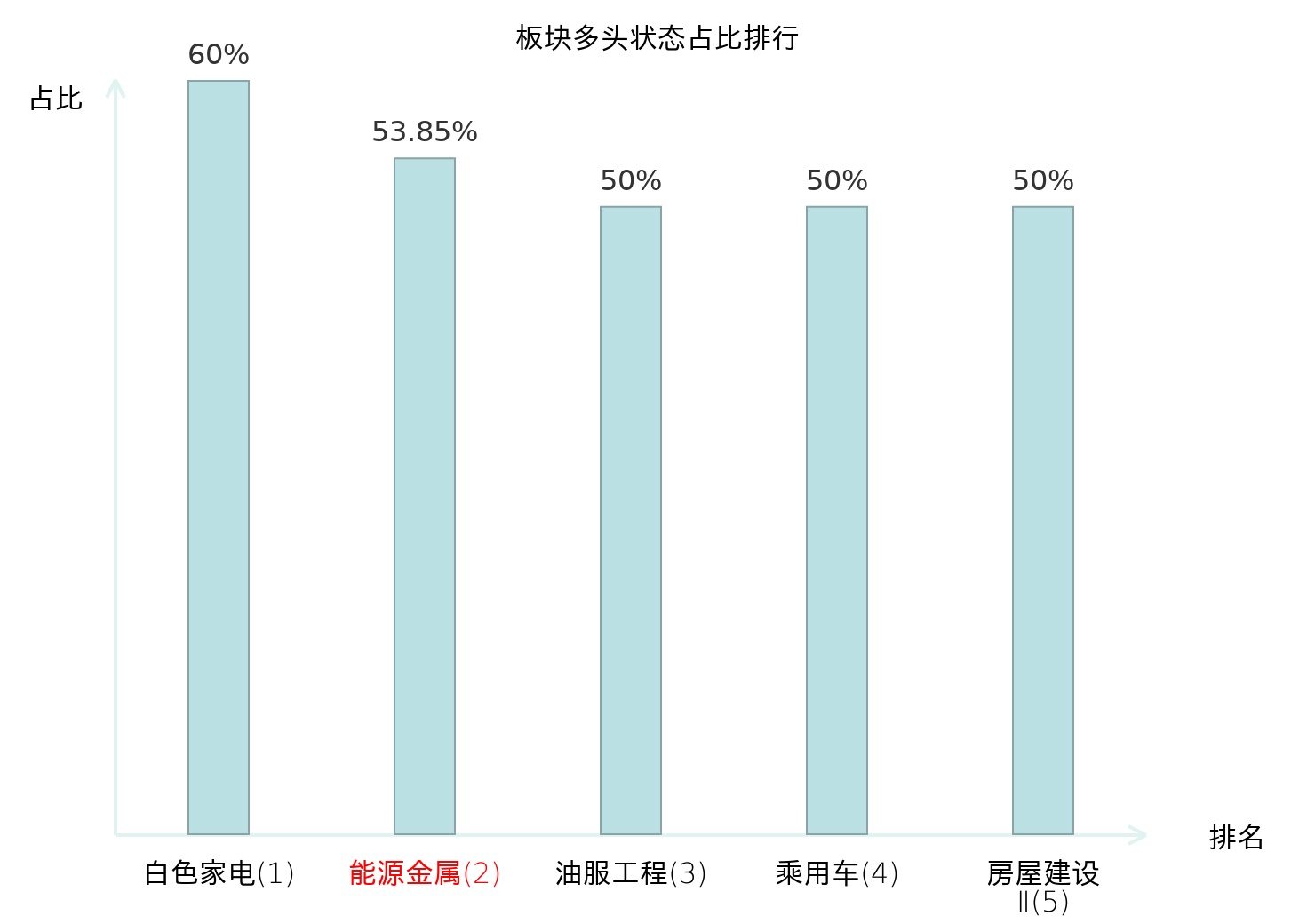 全市场所有行业板块中主力多头状态占比排名中,白色家电板块位居第一。油气开采Ⅱ板块名次提升最快,较昨日上升45位。