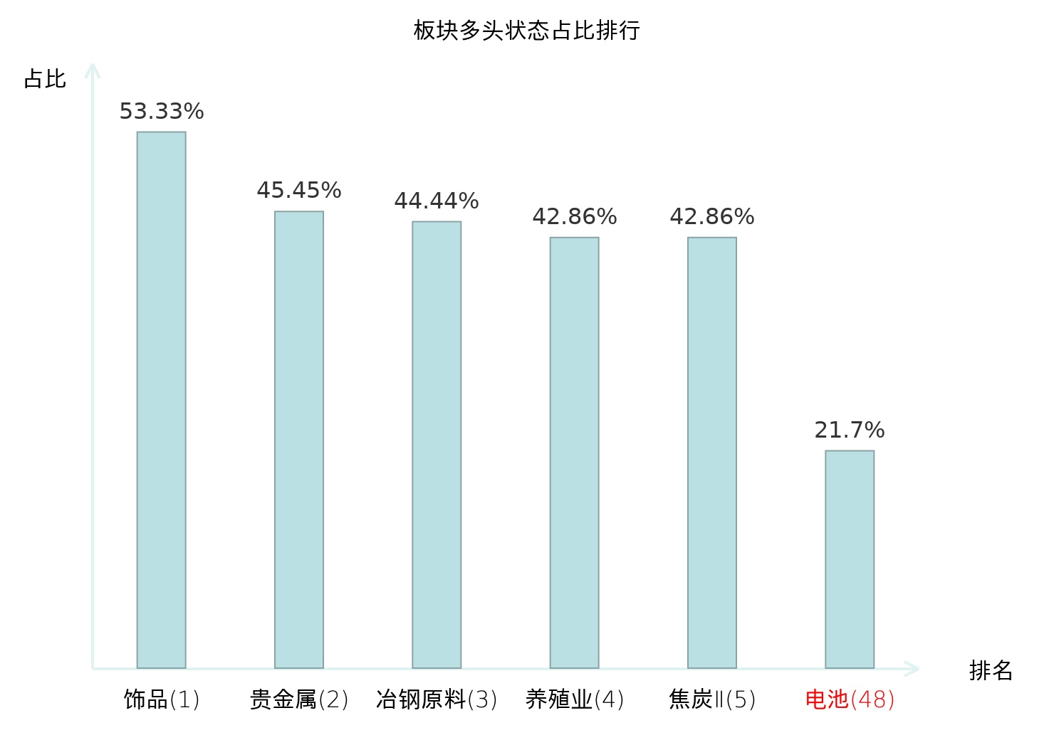 从主力宝信号数据分析,金银河所属的电池板块中共有23只股票处于主力多头状态,主力多头状态占比在全行业中排名第48位,较昨日下降7位。排名较高表明主力对于该板块整体看多意愿较强,此次排名下降可能反映了主力对该板块态度的调整。全市场所有行业板块中主力多头状态占比排名中,饰品板块位居第一;非金属材料Ⅱ板块名次提升最快,较昨日上升58位。这些变动体现了不同行业间主力资金偏好的变化,为投资者提供了关于市场动态和主力态度的重要参考。