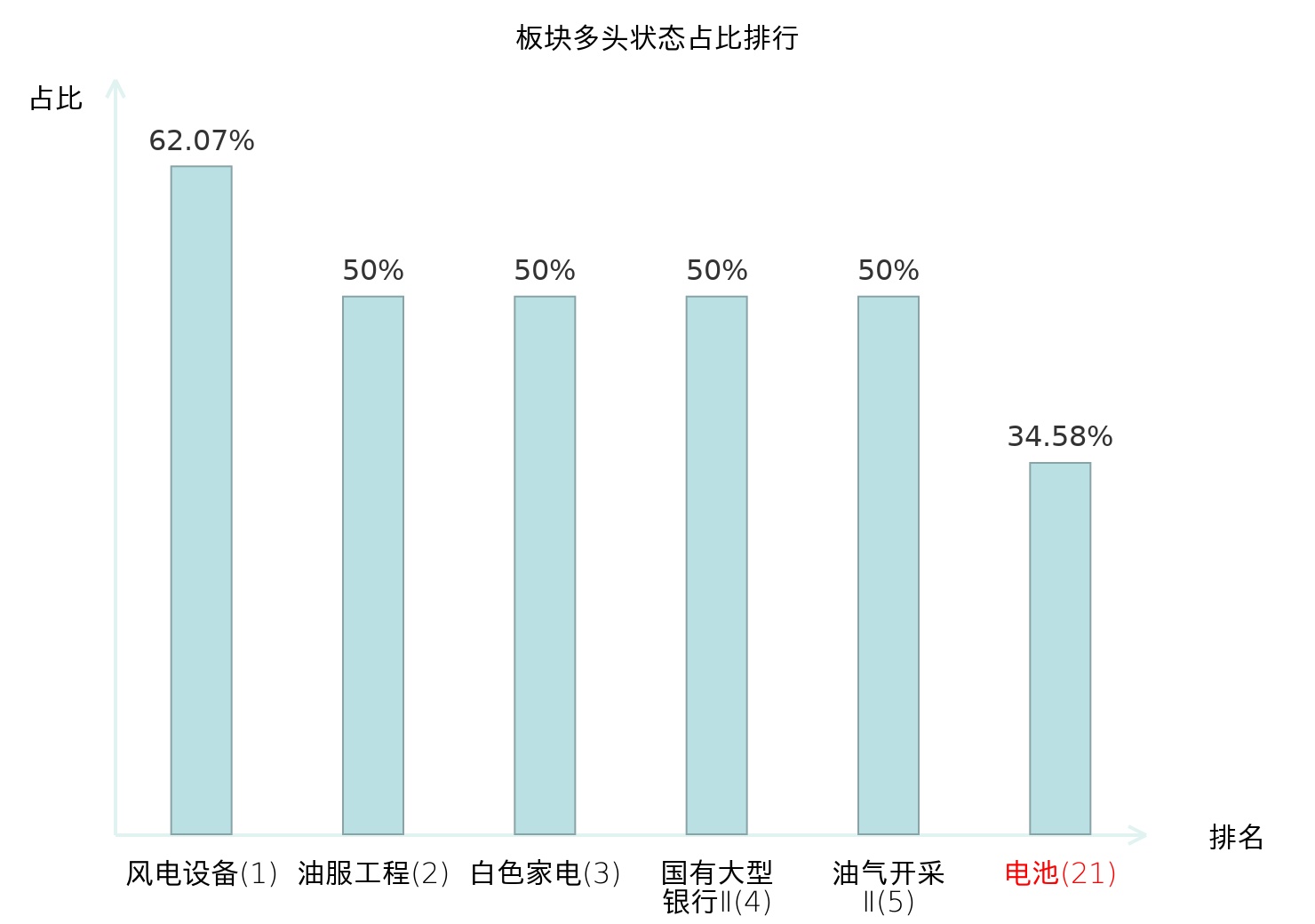 全市场所有行业板块中主力多头状态占比排名中,风电设备板块位居第一。动物保健Ⅱ板块名次提升最快,较昨日上升64位。
